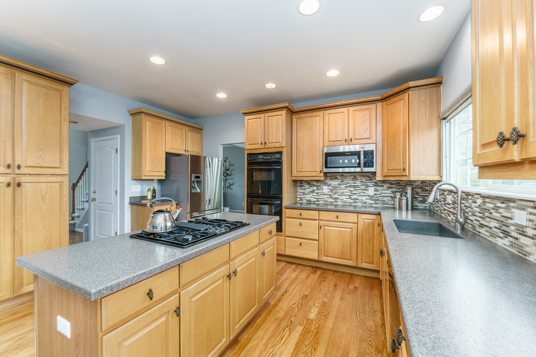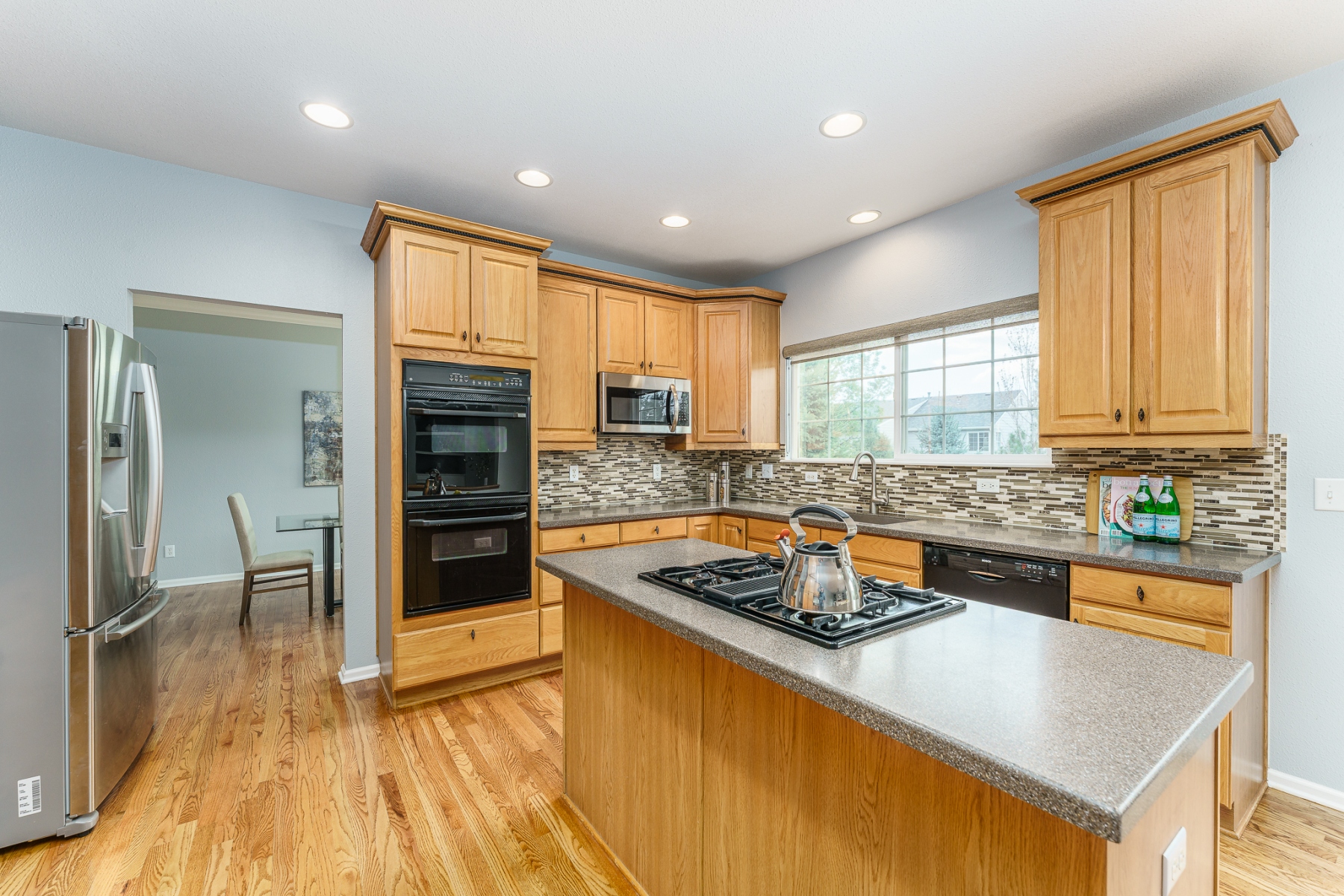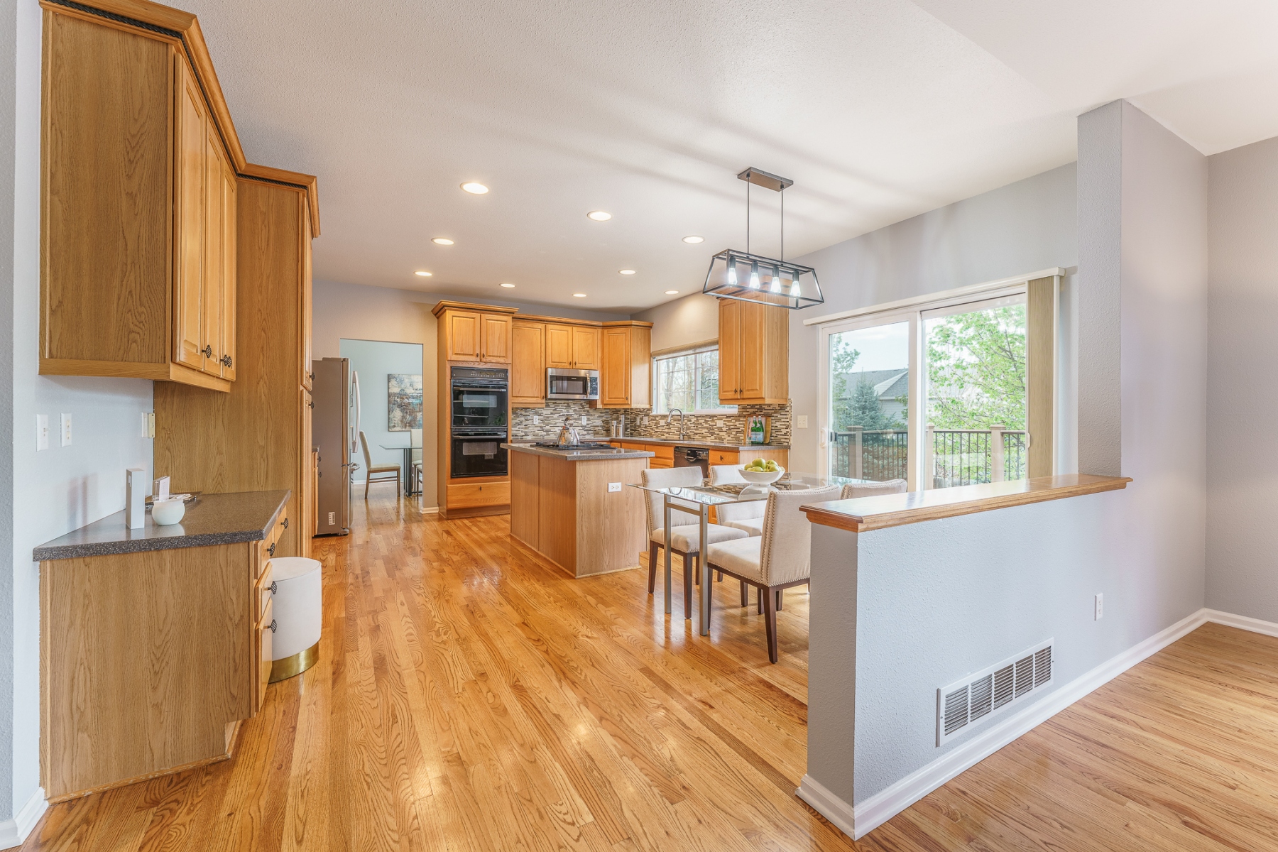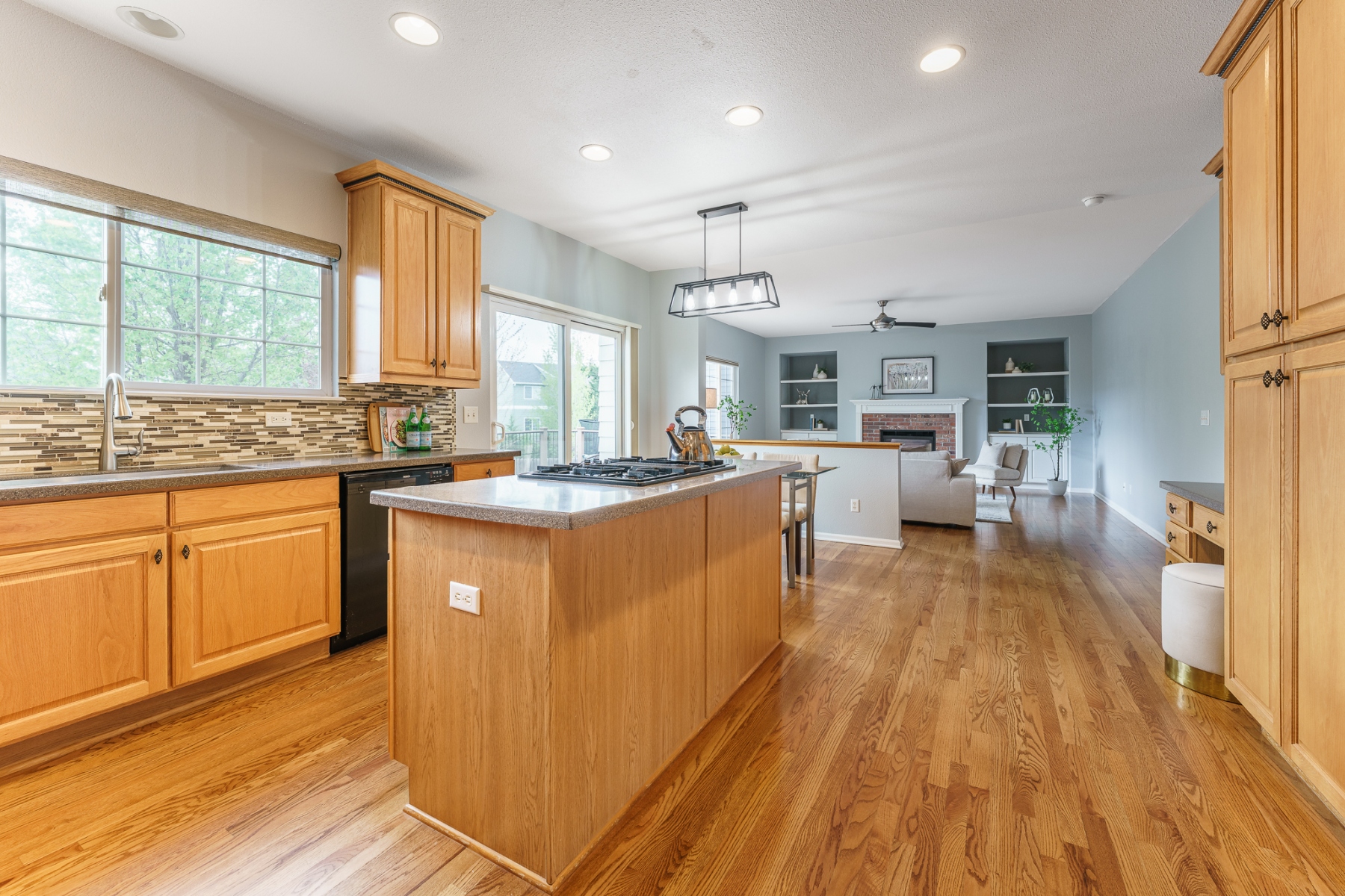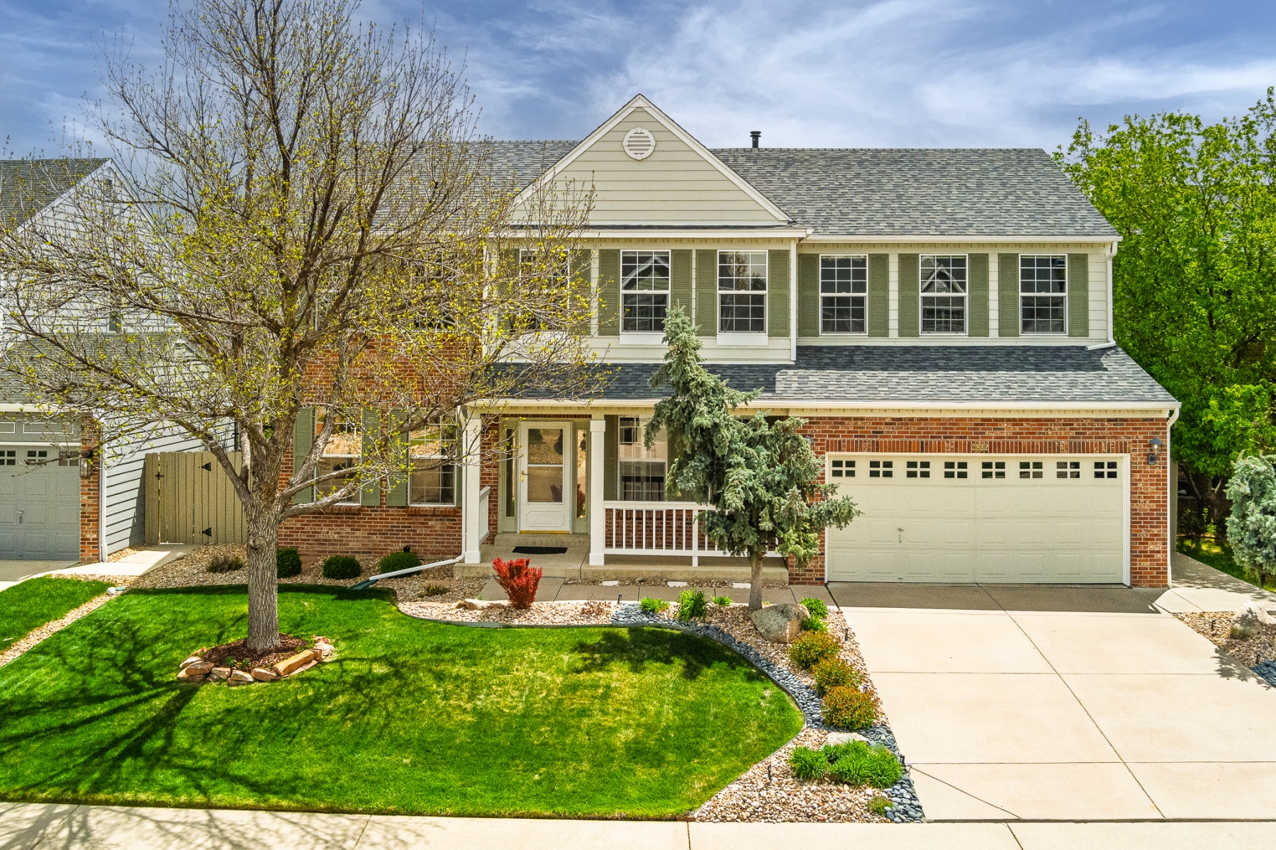 This stunning Isabella model Rock Creek home has been impeccably maintained and tastefully upgraded by the original homeowners. Nestled near the end of a quiet cul-de-sac and adjacent to a charming pocket park, this home is flooded with natural light from top to bottom, thanks to expansive windows, a soaring vaulted ceiling, an airy open floor plan, skylights, and a bright daylight basement. Upstairs features an elegantly upgraded 5-piece primary bath and a generously sized primary bedroom, along with three additional spacious bedrooms. The main level boasts gleaming hardwood floors throughout a dedicated office, a formal dining room, and kitchen with stone counter tops with an eat-in dining area. The comfortable family room includes a cozy gas fireplace. Step outside to a large Trex deck that offers ample space for outdoor dining and entertaining, overlooking a meticulously manicured, rabbit-proof backyard with mature landscaping and lush, vibrant grass. The light-filled basement is equipped with multiple built-in speakers for theater systems and is pre-wired for a pool table light, making it ideal for recreation or media. Quite possibly the most impeccably kept home in Rock Creek, this residence is a rare find offering comfort, style, and thoughtful upgrades throughout.