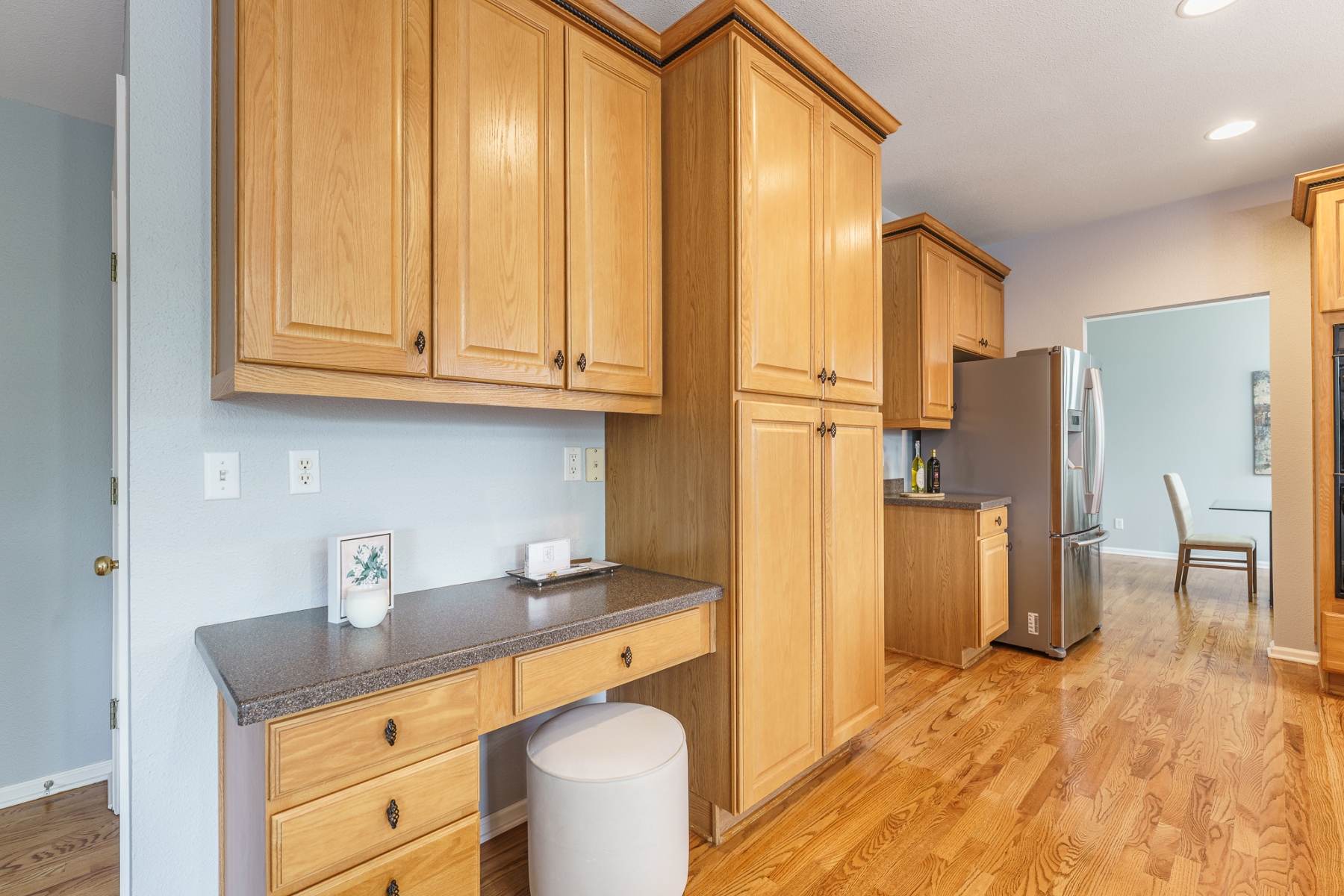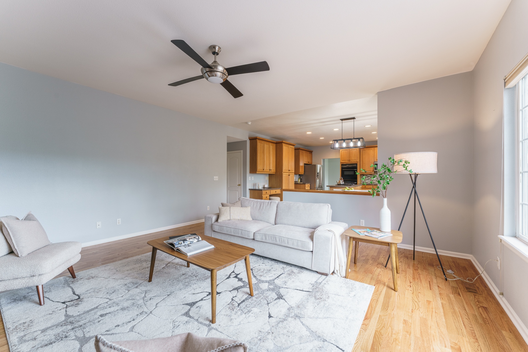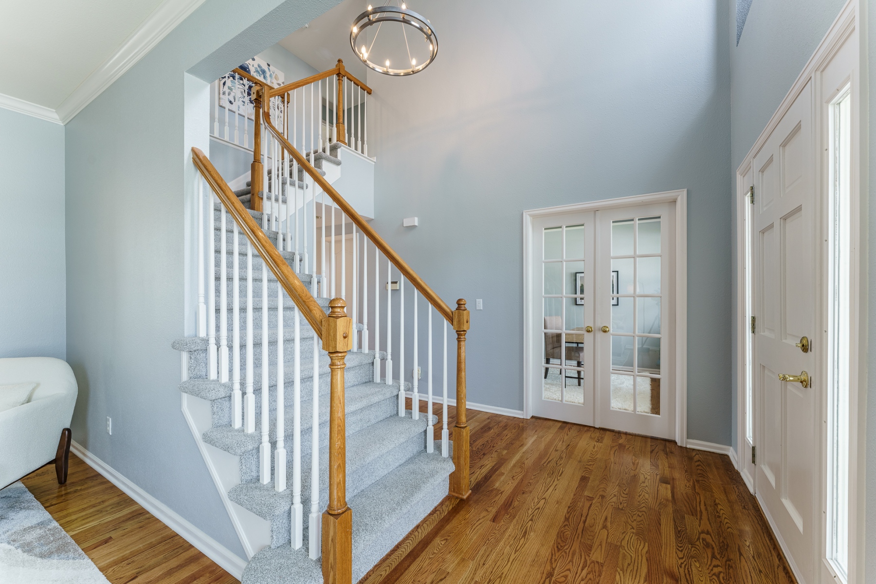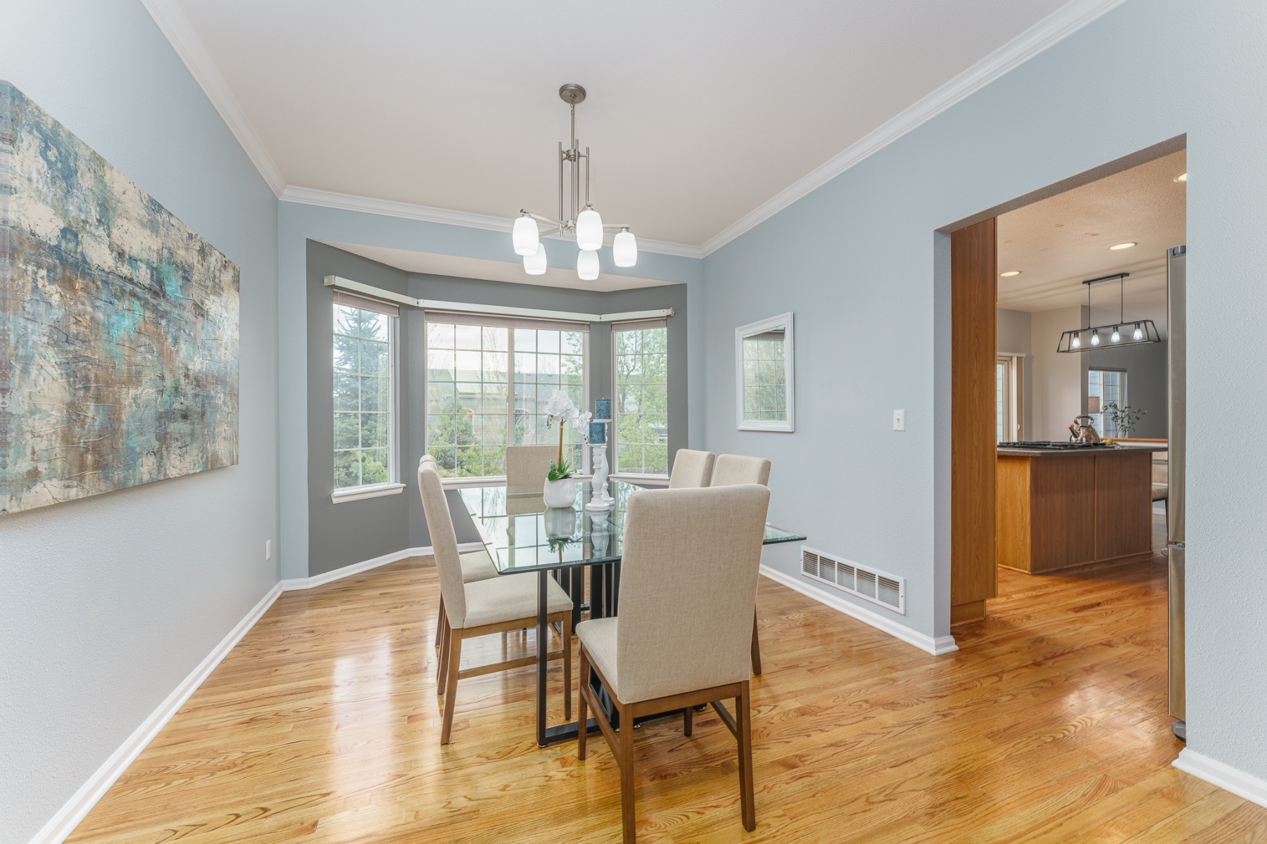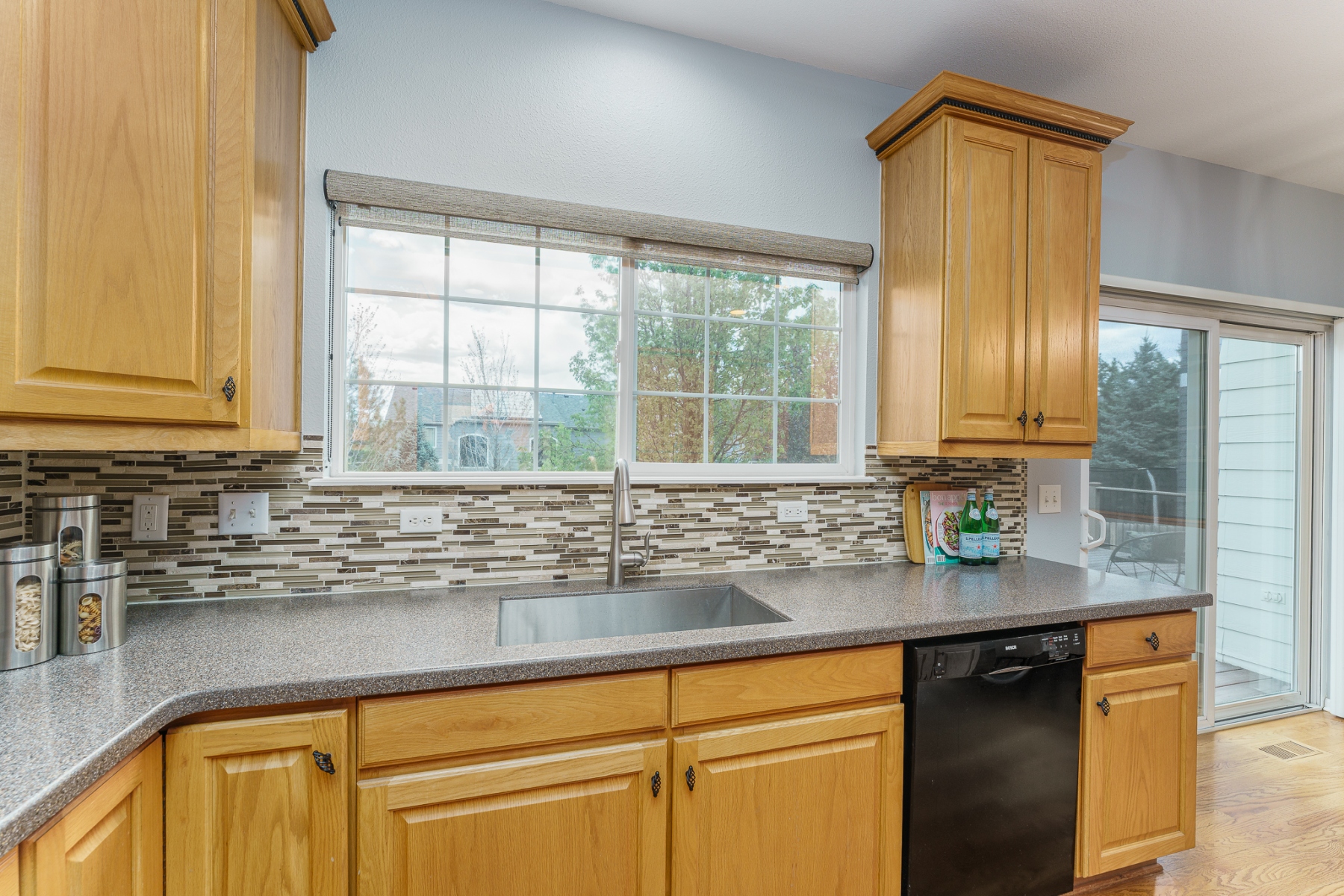 This stunning Isabella model Rock Creek home has been impeccably maintained and tastefully upgraded by the original homeowners. Nestled near the end of a quiet cul-de-sac and adjacent to a charming pocket park, this home is flooded with natural light from top to bottom, thanks to expansive windows, a soaring vaulted ceiling, an airy open floor plan, skylights, and a bright daylight basement. Upstairs features an elegantly upgraded 5-piece primary bath and a generously sized primary bedroom, along with three additional spacious bedrooms. The main level boasts gleaming hardwood floors throughout a dedicated office, a formal dining room, and kitchen with stone counter tops with an eat-in dining area. The comfortable family room includes a cozy gas fireplace. Step outside to a large Trex deck that offers ample space for outdoor dining and entertaining, overlooking a meticulously manicured, rabbit-proof backyard with mature landscaping and lush, vibrant grass. The light-filled basement is equipped with multiple built-in speakers for theater systems and is pre-wired for a pool table light, making it ideal for recreation or media. Quite possibly the most impeccably kept home in Rock Creek, this residence is a rare find offering comfort, style, and thoughtful upgrades throughout.